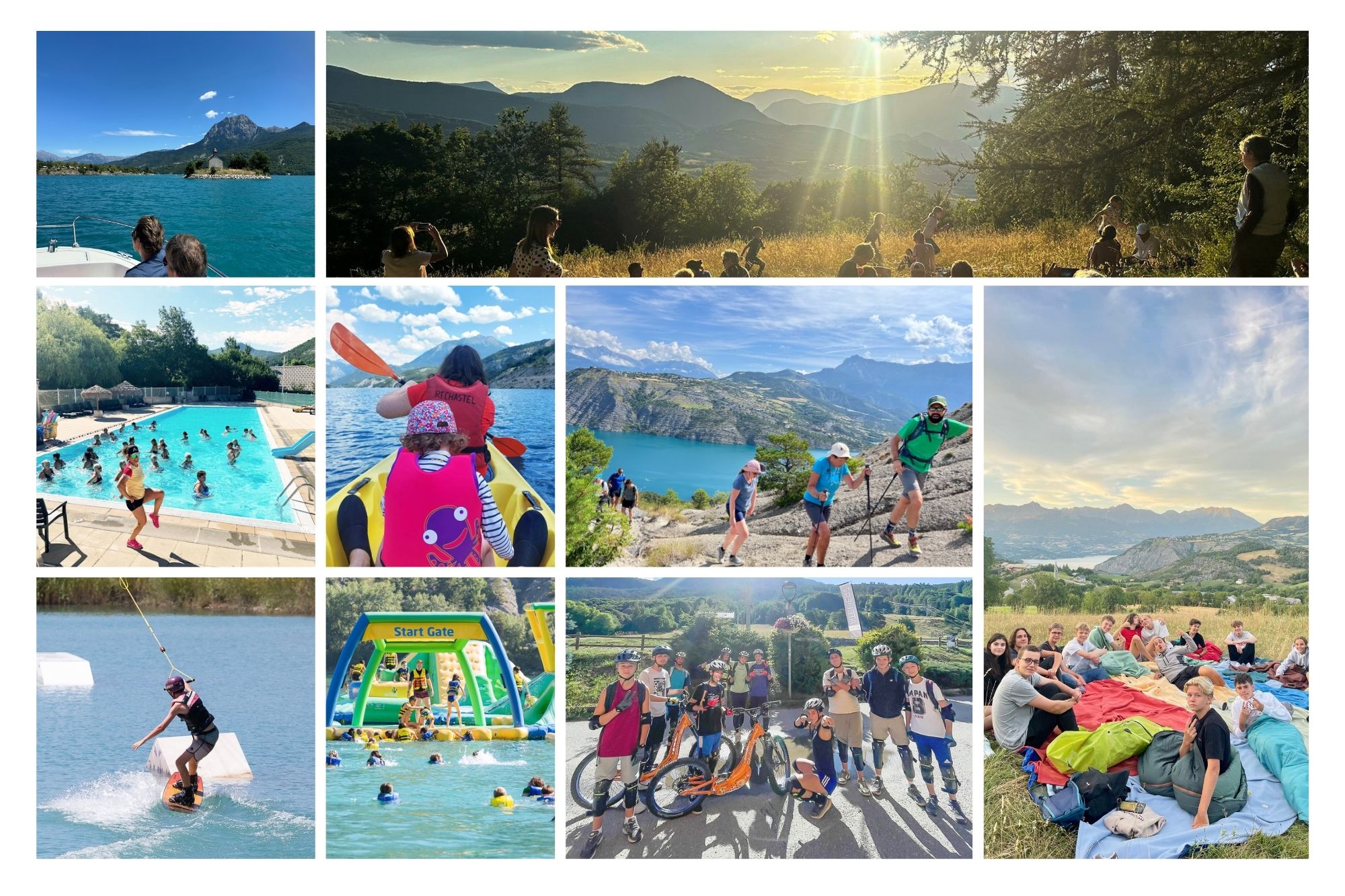 Nuit bivouac, grands jeux, canoë, paddle, Wake board et bouée tractée, Trottin’herbe, escalade, balades et randos, fabrication du barrage de Serre-Ponçon, atelier « la vie du trappeur », fabrication de fours solaires, écolo jeux, danse et jeux piscine…